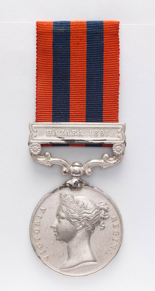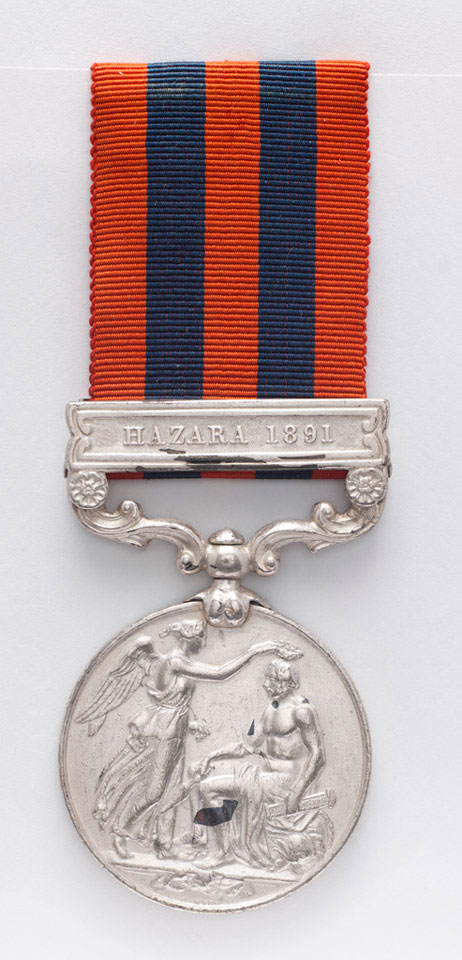Silver, circular campaign medal with an effigy of Queen Victoria and inscription, 'Victoria Regina', on the obverse; on the reverse, the figure of Winged Victory crowning a kneeling figure with a laurel wreath; red and dark blue ribbon with clasp, 'Hazara 1891'.