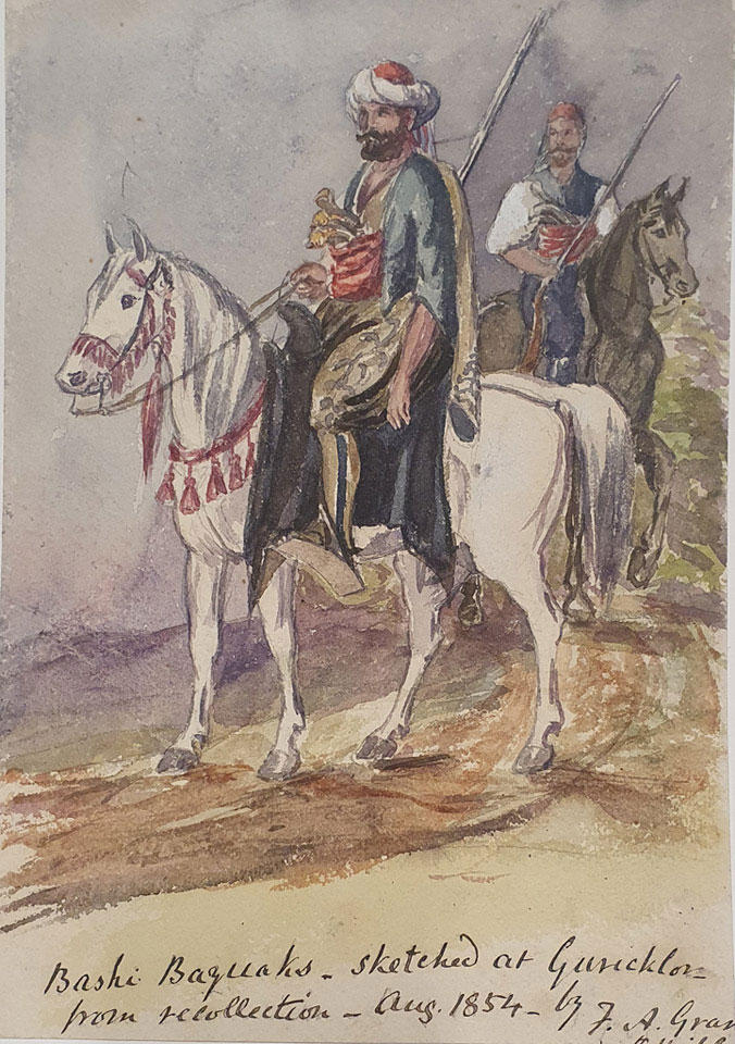 During the Crimean War (1854-1856) 4,000 Bashi Bazouks, Turkish irregulars, were placed under the command of Lieutenant-Colonel (later Major-General) William Fergusson Beatson (1804-1872). The Bashi Bazouks had earned an unsavoury reputation for pillage and indiscipline during fighting in Silistria. In spite of the subsequent attempt of Beatson to instil order into the irregulars brought into British pay, his efforts were undermined by the refusal of Lord Raglan to make use of them.