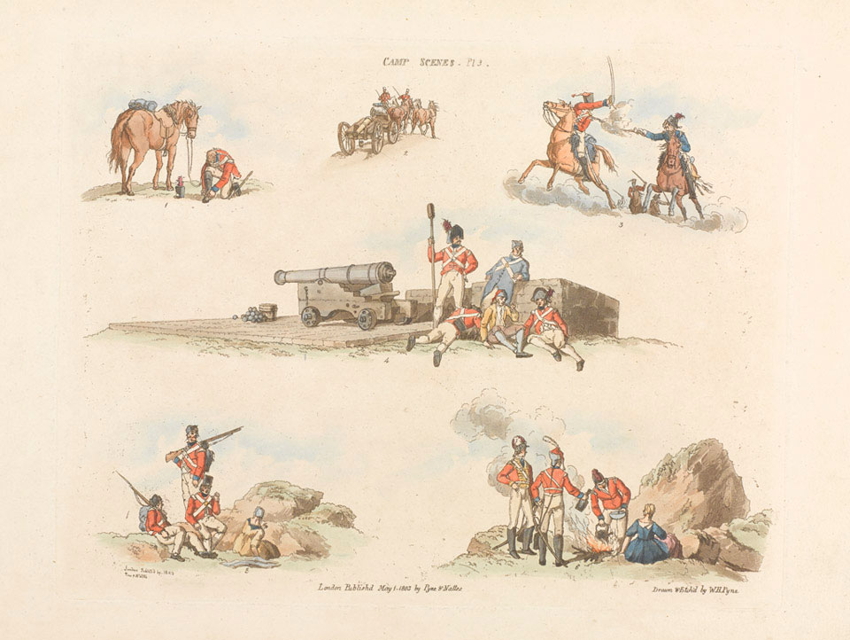 Six vignettes of British soldiers during the Napoleonic Wars (1803-1815). The images include a naval cannon with crew at rest, cavalrymen skirmishing, soldiers and a camp follower gathered around a fire, and a field gun team.