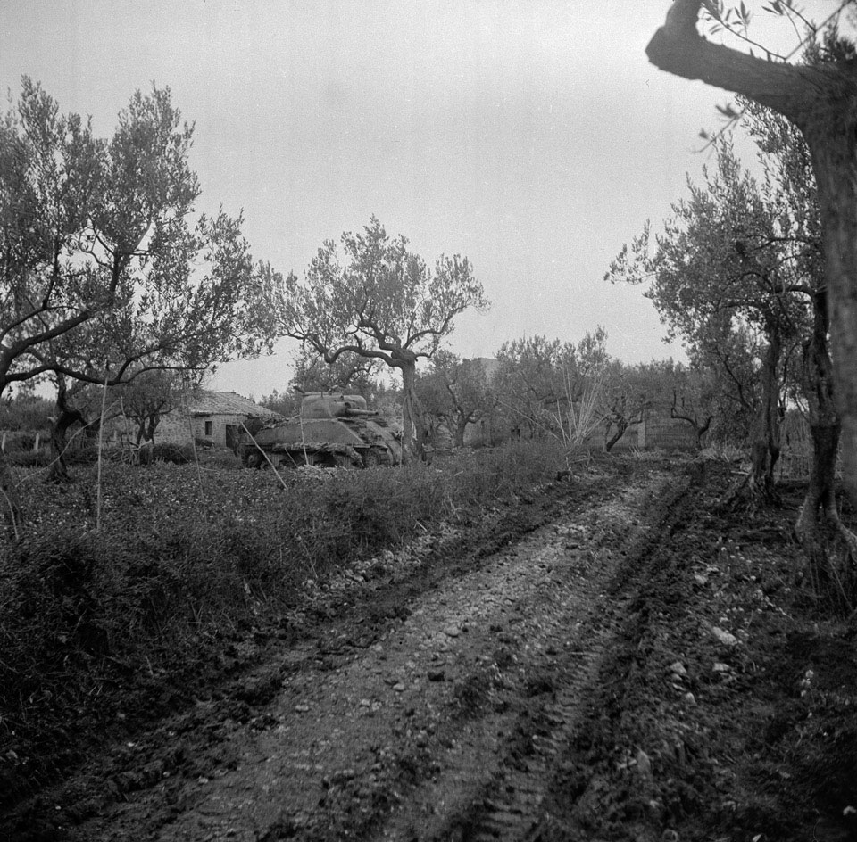 Damaged Sherman tank in an olive grove near the River Moro.