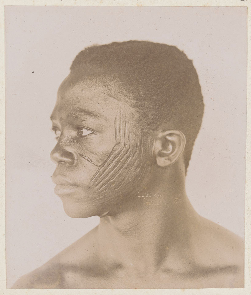 Bandsman Yessafu was a Mamprusi from the White Volta area in the north of the Gold Coast (now Ghana). This image depicts his tribal markings on his face.