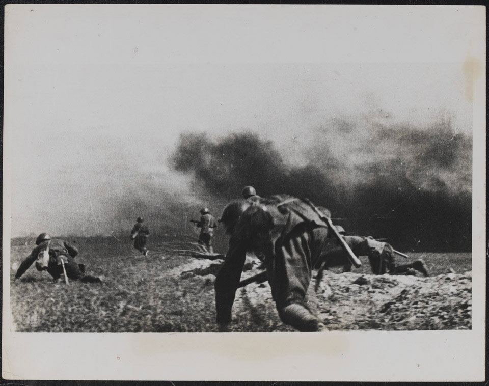 Soviet troops advancing under fire in the Dnieper area, January 1944