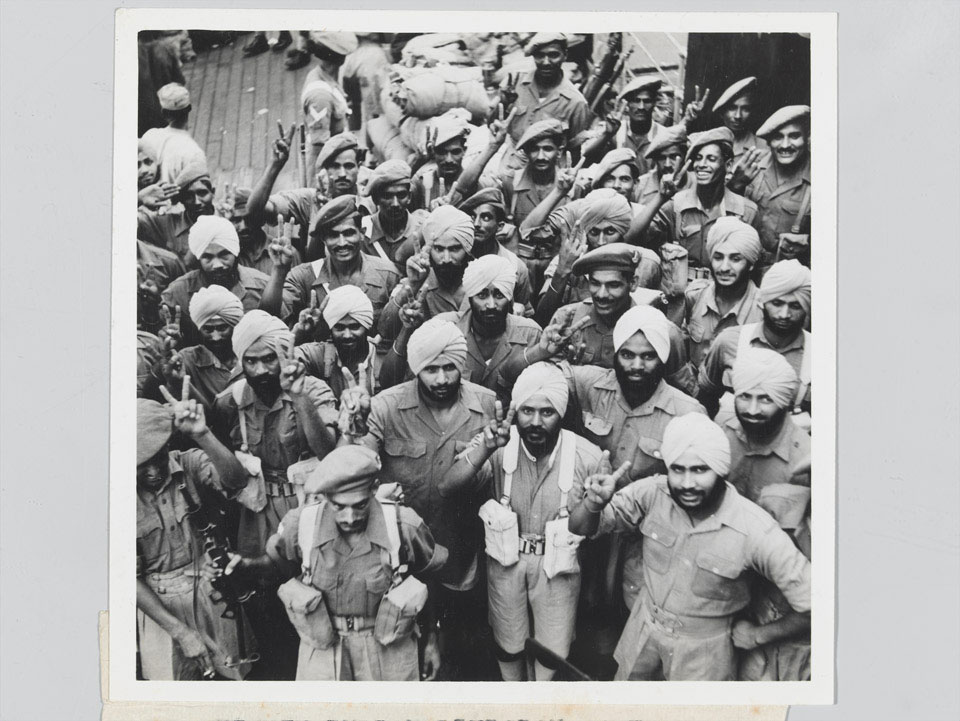 Soldiers of 6th and 8th Indian Divisions giving the victory salute on their return to India after serving with PAIFORCE, February 1946