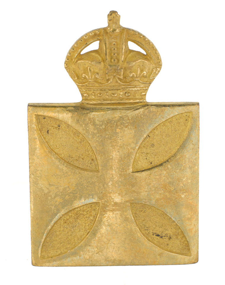 Gilt metal badge by J R Gaunt; a burnished cross pattée on a frosted square ground, surmounted by a King's crown. Inscribed on reverse with maker's name, 'J R Gaunt'; with two lugs.