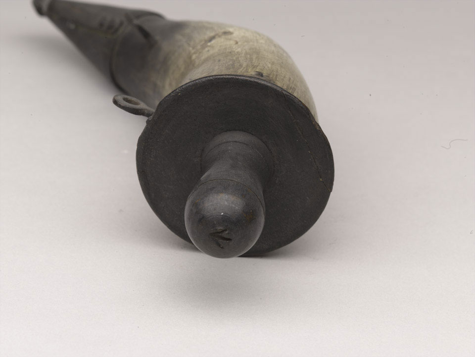 A powder horn was a container used by a soldier to carry gunpowder. They were made from cow and buffalo horns and usually had a plug or stopper at one end and a lid at the other. This example, manufactured by Gibson, Thomson and Crane of Edinburgh, is engraved '3rd Ft' and belonged to a soldier of the 3rd Regiment of Foot, or The Buffs.