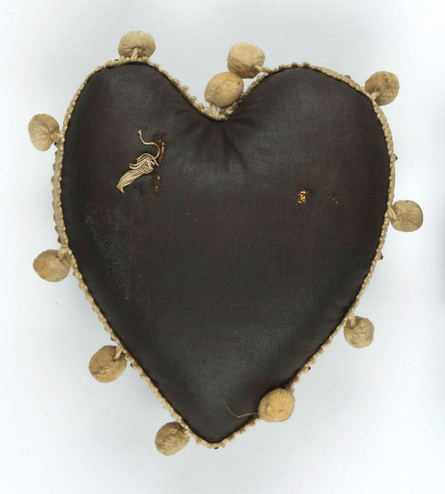 Heart-shaped cushion made from black velvet, edged with fawn coloured crochet lace and woollen baubles, backed in dark brown cotton sateen. The front is decorated with four pink silk shell shapes around a central strip of cream silk with the words, 'Think of me/ When the Golden/ Sun is Sinking/ and Your Mind from/ Care Set Free/ When on Others/ You are Thinking/ Will you Sometimes/ Think of Me'. Two pieces of paper either side on the front state, 'Forget/ Me Not' in blue ink. Silver thread and sequins decorate the front, amidst yellow, white and amber glass bead pins.