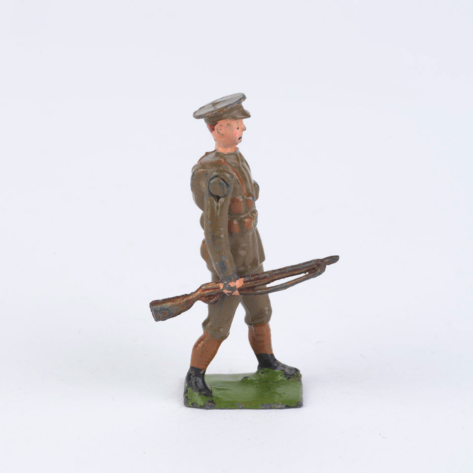 Figure of a soldier in khaki uniform with moveable right arm holding rifle at the trail. One of a boxed set of eight toy soldiers.