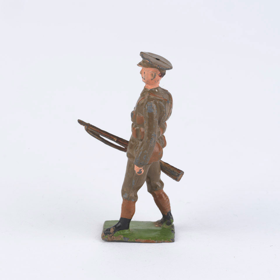 Figure of a soldier in khaki uniform with moveable right arm holding rifle at the trail. One of a boxed set of eight toy soldiers.