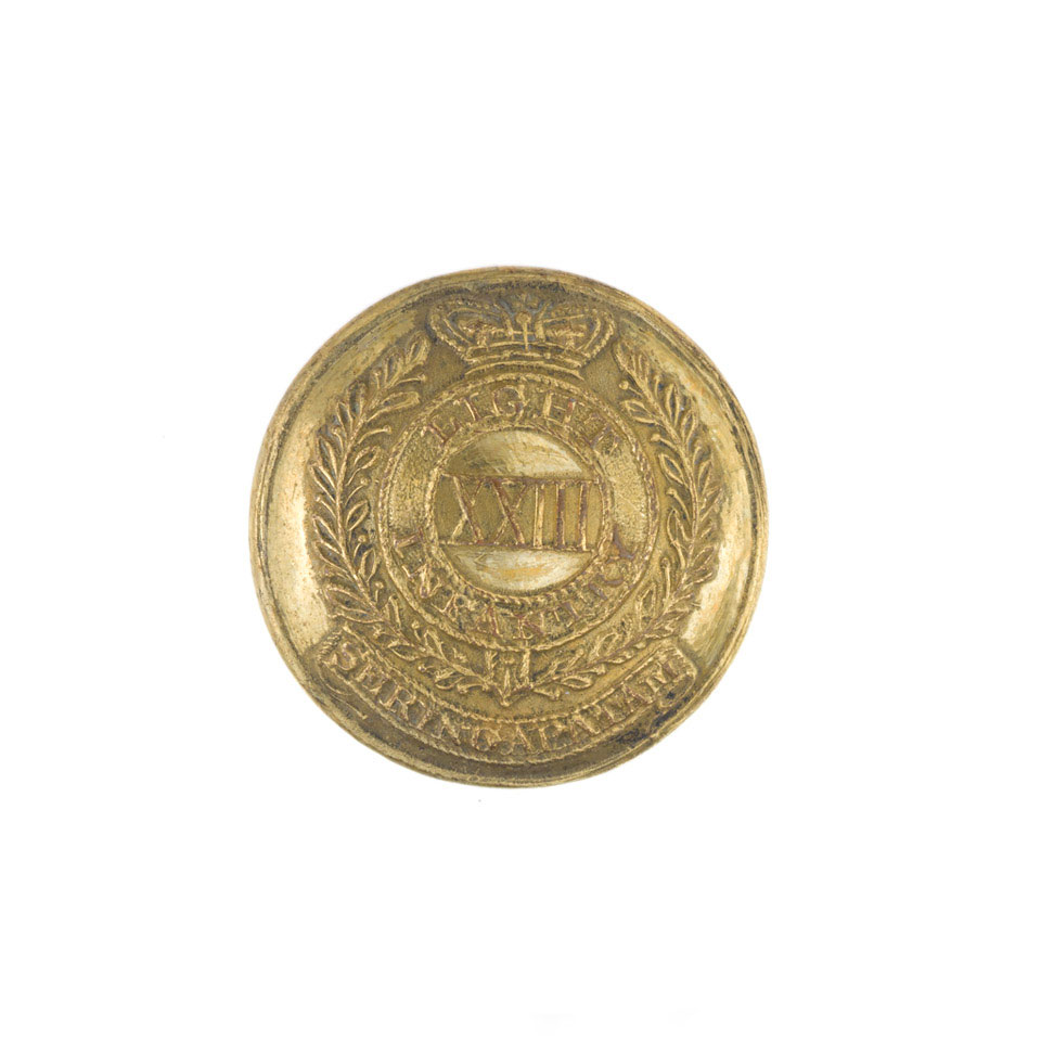 Large, gilt button with the regimental number in Roman numerals, 'XXIII', within a wreathed circlet inscribed, 'Light Infantry', with a scroll bearing the battle honour, 'Seringapatam'.