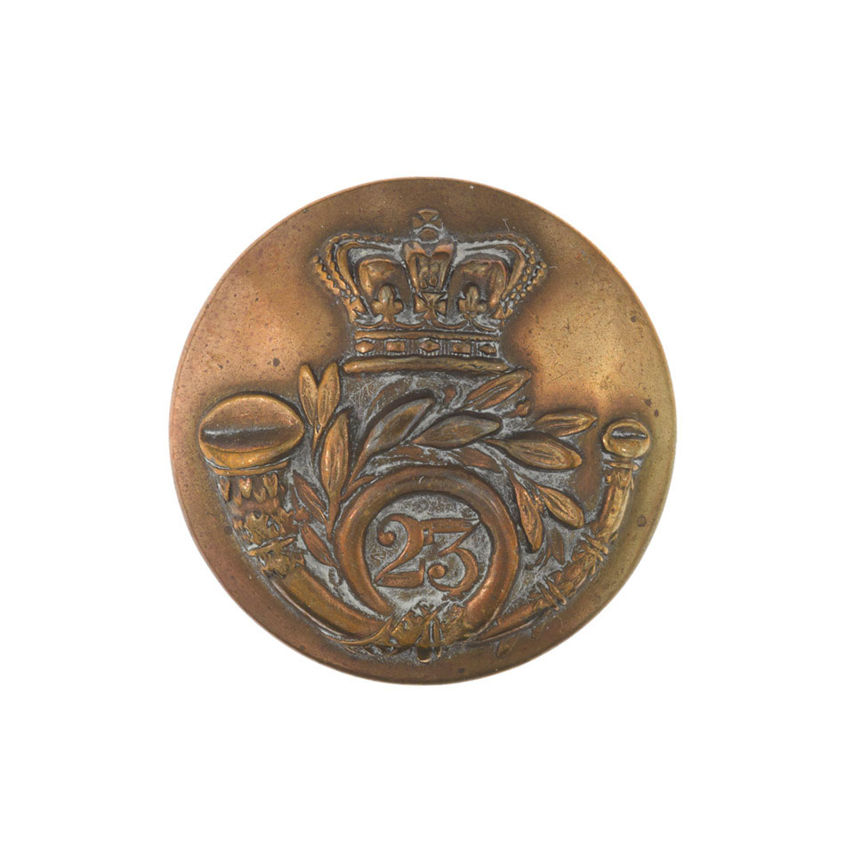 Large, gilt metal button by Firmin and Sons Limited, London, with bugle horn encircling regimental number, '23', with branch of leaves, surmounted by an Imperial Crown.