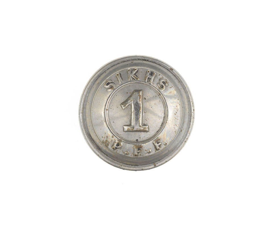 White metal, medium button made by Hobson and Sons Limited, Lexington St, London, with regimental numeral, '1', within a quoit, or chakram, '1', with the title, 'Sikhs', and initials, 'P.F.F.' inscribed above and below.