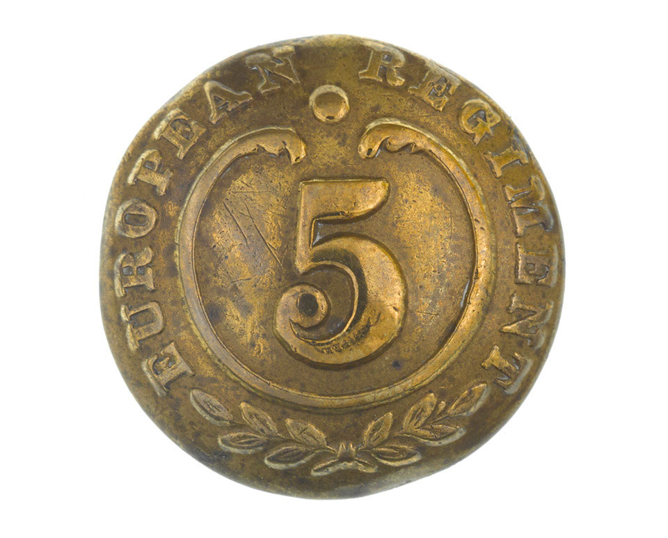 Circular brass button by Smith, Kemp and Wright of Birmingham, with numeral '5' within a French circle and dot, surrounded by the regimental title, 'European Regiment' and a wreath.