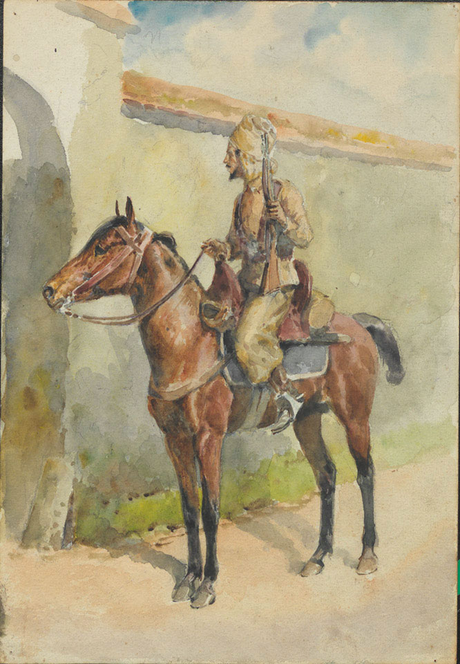 The Spahi regiments of the French Army originated in auxiliary forces raised during France's colonial conquests in North Africa. These units of primarily Arab and Berber irregular cavalry from Morocco, Tunisia and Algeria were commanded by French officers. They were eventually incorporated into the regular French Army and Spahi units fought in the Crimea (1854-1856) and on French soil during the Franco-Prussian War (1870-1871). During World War One (1914-1918) Spahi units fought on the Western Front, and by 1918, the number of regiments had increased from four to seven. By 1915 the French Spahi units had adopted a standard khaki uniform but they retained their Zouave style uniform, with Arab headdress and hooded cloak, for ceremonial duties.