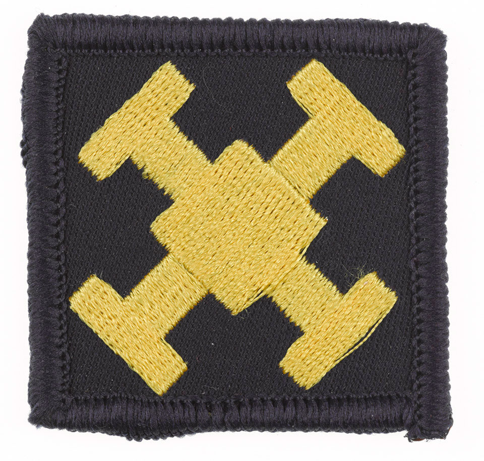 Woven diamond shaped patch with yellow embroidered Cross of St Chad on a blue ground.