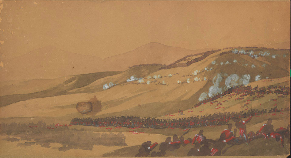 One of three watercolours that form a panorama showing Allied forces in action at the Battle of the Alma during the Crimean War (1854-1856).