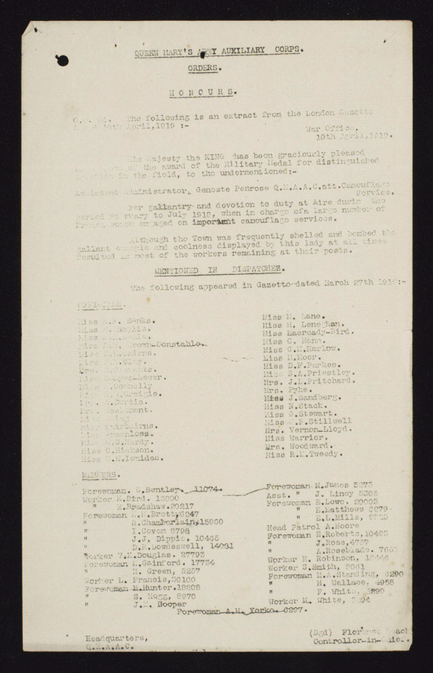 This extract from 'The London Gazette' lists the names of Queen Mary's Army Auxiliary Corps women mentioned in despatches. The latter included Adjutant Administrator Geneste Penrose who was also awarded the Military Medal while working for the Camouflage Service. She was on duty at Aire and in charge of a large number of French workers who remained at their posts under her command despite heavy shelling.