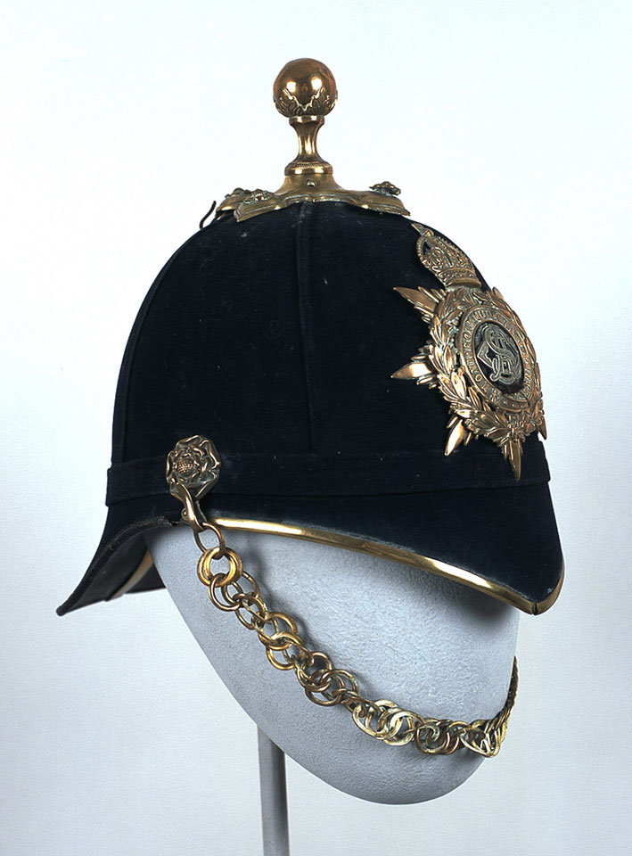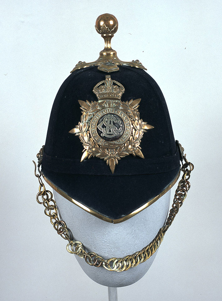 This pattern helmet was introduced in 1878 and used for full dress until the outbreak of the First World War. Made of cork and covered in blue wool cloth, they could be fitted with either a spike or a ball top fitting. Regiments and Corps using horses, including the Army Service Corps always used a ball top fitting to prevent injuries to horses while adjusting saddles or harness.
