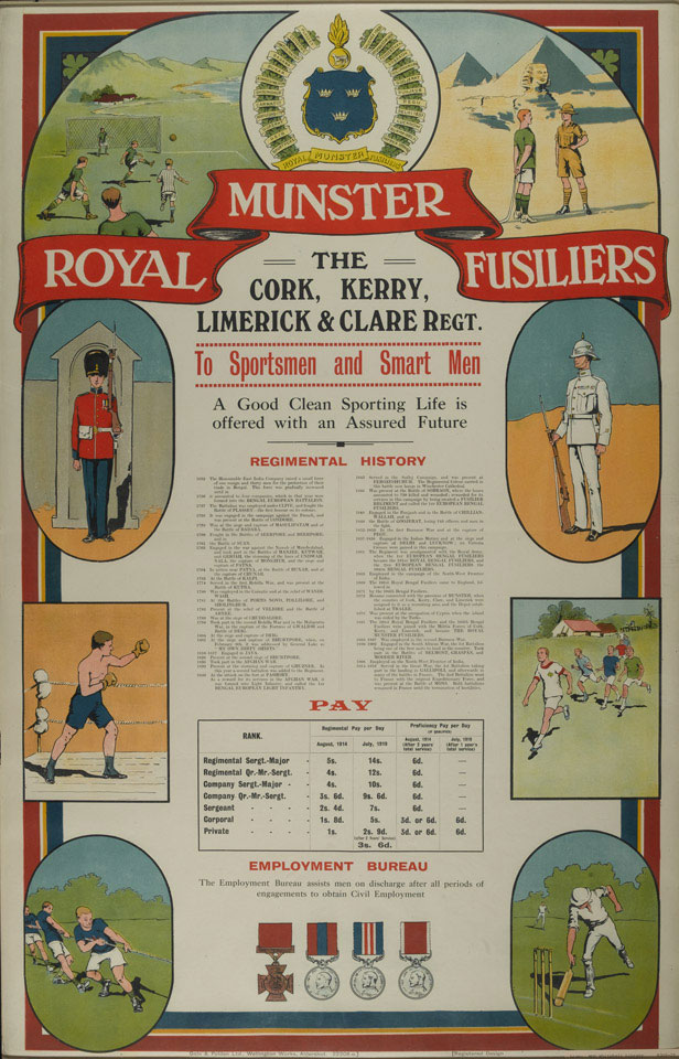 Among the sports favoured by the Royal Munster Fusiliers were football, athletics, boxing, tug-of-war and cricket. For the 'sportsmen and smart men' of Cork, Kerry, Limerick and Clare, the regiment offered a 'good clean sporting life [and] assured future.'
